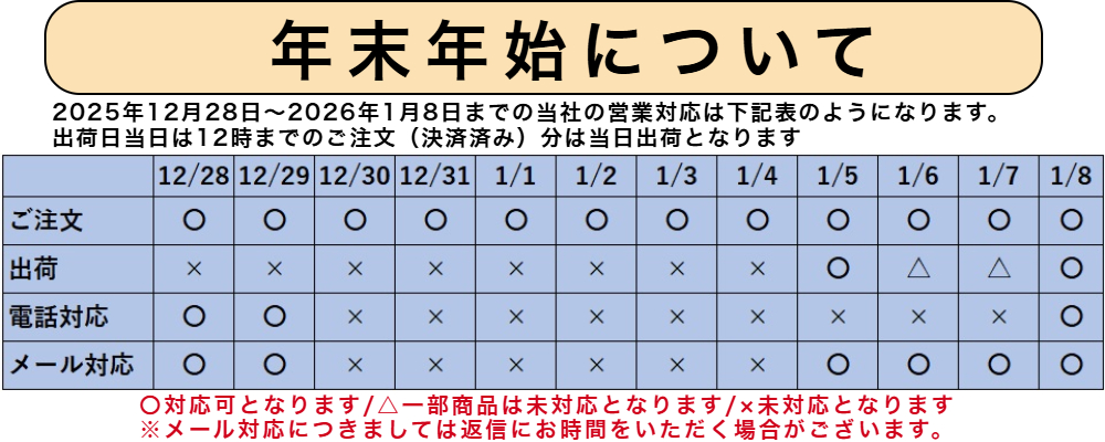 出荷日当日は12時までのご注文(決済済み)分は当日出荷させていただきます。